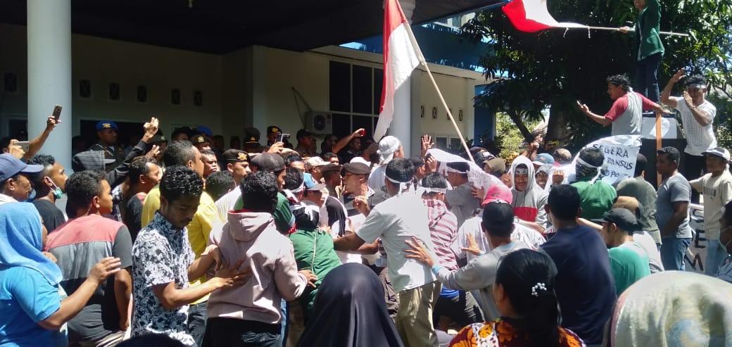 SANANA – Aksi demonstrasi yang dilakukan Warga Desa Pohea, Kecamatan Sanana, Kabupaten Kepulauan Sula (Kepsul) di depan kantor Dinas Pekerjaan Umum Penataan Ruang Perumahan dan Kawasan Permukiman (DPUPRPKP) serta gedung DPRD, berlangsung ricuh.