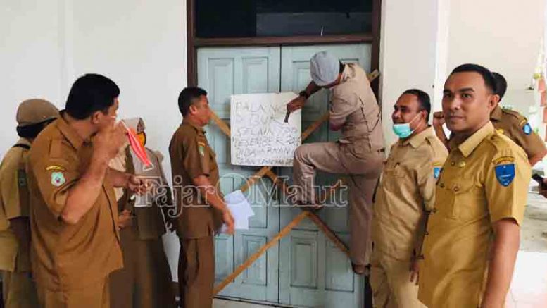 TERNATE – Kantor Dewan Perwakilan Rakyat Daerah (DPRD) Kota Ternate, disegel oleh staf Sekretariat pada Selasa 9 Februari, sekitar pukul 16.20 WIT. Amatan Fajar Malut di lapangan, pintu ruangan pimpinan DPRD, pintu ruangan Sekwan, pintu ruang fraksi dan pintu eksekutif room di palang dengan balok kayu.