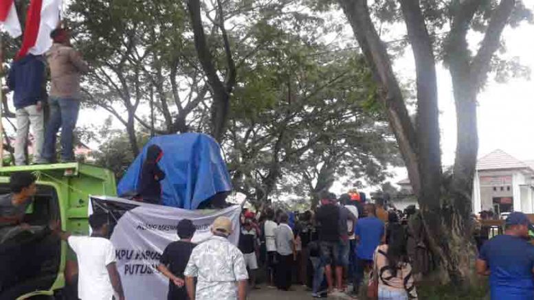 Massa yang datang ke kantor KPU ini sendiri berjumlah puluhan orang dengan mengendarai kendaraan roda empat dan dua yang membawa spanduk bertuliskan “KPU harus Konsisten dengan Amar putusan Mahkamah Konstitusi”.