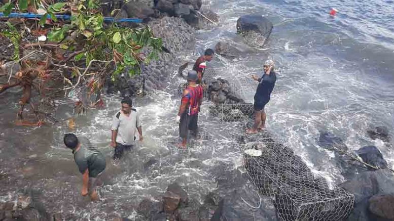 TERNATE – Warga Kelurahan Dufa-Dufa, Kota Ternate Utara, melakukan gotong royong membuat bronjong penahan ombak.
