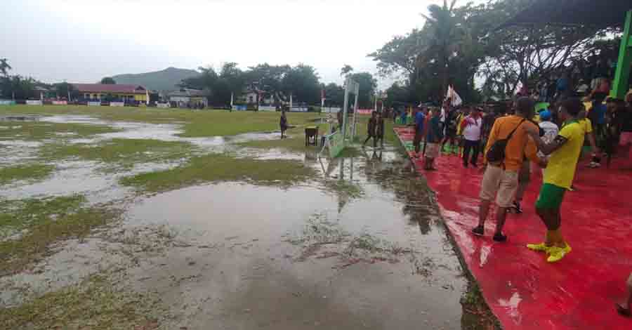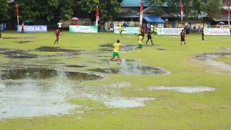 MABA – Kendati cuaca panas akan tetapi jika hujan turun, lapangan sepak bola yang digunakan pada kegiatan Mabapura Open Tournament (MOT) ke-V ibarat kolam renang. Pasalnya, lapangan satu satunya milik Persemapura Mabapura itu sangat parah jika terjadi hujan.
