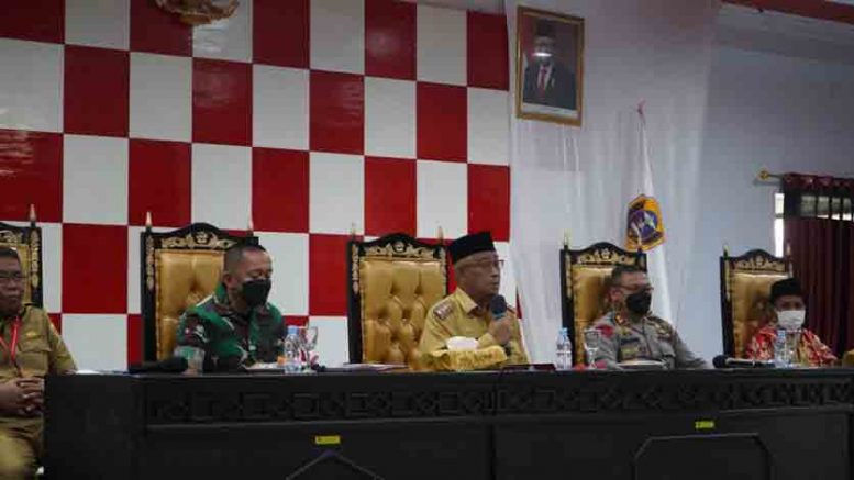 TIDORE – Menindaklanjuti hasil rapat Presiden Republik Indonesia secara virtual dengan seluruh Kepala Daerah pada (senin, 7/2/2022) tentang percepatan vaksinasi dan perketat protokol kesehatan di wilayah masing-masing, Walikota Tidore Kepulauan Capt, H. Ali Ibrahim memimpin pertemuan bersama Sekretaris Daerah Kota Tidore Kepulauan, Kapolres Tidore, Dandim 1505/Tidore, para Asisten Sekda, Staf Ahli Walikota, pimpinan OPD, Camat dan Lurah se Kota Tidore dalam rangka percepatan Vaksinasi Covid-19 Dosis II, III dan vaksinasi untuk anak usia 6-11 Tahun di Kota Tidore, yang bertempat di Aula Sultan Nuku kantor Walikota Tidore, Selasa (8/2/2022).