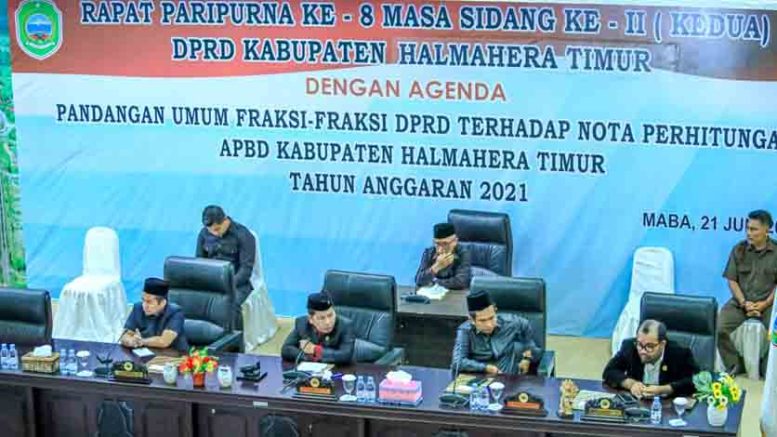 MABA – Dewan Perwakilan Rakyat Daerah (DPRD) Kabupaten Halmahera Timur (Haltim) menggelar sidang Paripurna ke 8 masa sidang ke dua tentang Pandangan umum fraksi DPRD terhadap nota perhitungan APBD Kabupaten Halmahera Timur Tahun anggaran 2021, Selasa ( 21/06/2022).