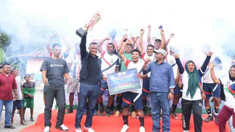 TIDORE – Wakil Walikota Tidore Kepulauan Muhammad Sinen memberikan sambutan sekaligus menutup secara resmi Turnamen Sepak Bola Gawang Sedang Karang Taruna Basudara Cup I Tahun 2022 di Lapangan Akeguraci, Desa Akeguraci Kecamatan Oba Tengah.