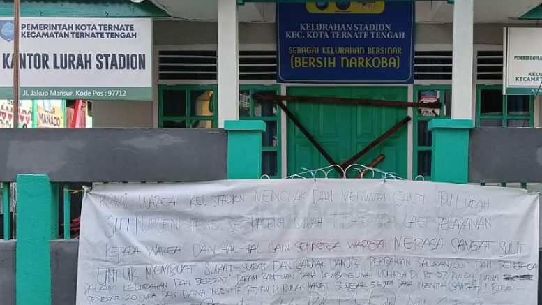 TERNATEWarga di kelurahan Stadion Kecamatan Ternate Tengah, Kota Ternate kesal dengan pelayanan di kantor lurah Stadion. Hal ini membuat warga pada Kamis (22/9/2022) memalang kantor yang terletak di sekitar stadion gelora tersebut.