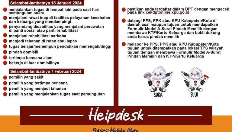 “Pemilih yang akan melakukan pindah memilih ini harus mengurus dokumen pindah memilih di KPU kabupaten, Panitia Pemilihan Kecamatan atau Panitia Pemungutan Suara selambat-lambatnya 30 hari sebelum hari pemungutan suara yaitu tanggal 15 Januari 2024,” ucap Ketua KPU Halteng Bahri Hasbullah.