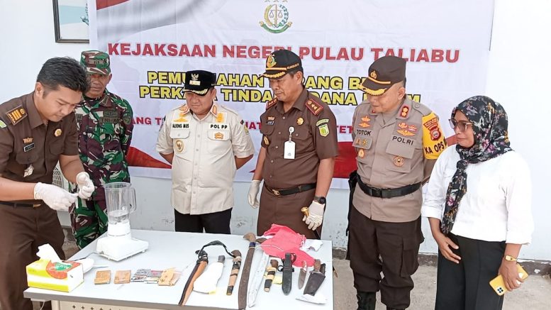 Bupati Aliong Mus bersama Kepala Kejaksaan Negeri dan TNI – Polri setempat dalam musnahkan yang dilakukan di Kantor Kejari Kabupaten Pulau Taliabu, Rabu (18/10/2023).