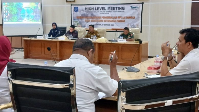 TERNATE – Untuk menjaga ketersediaan stok pangan maupun laju inflasi di Kota Ternate bisa ditekan, pada Selasa (31/10/2023), Tim Pengendalian Inflasi Daerah (TPID) Kota Ternate kembali menggelar rapat koordinasi atau High Level Meeting dengan tema “Sinergi dan Kolaborasi Pengendalian Inflasi Pangan Guna Mendukung Ketahanan Pangan,”.
