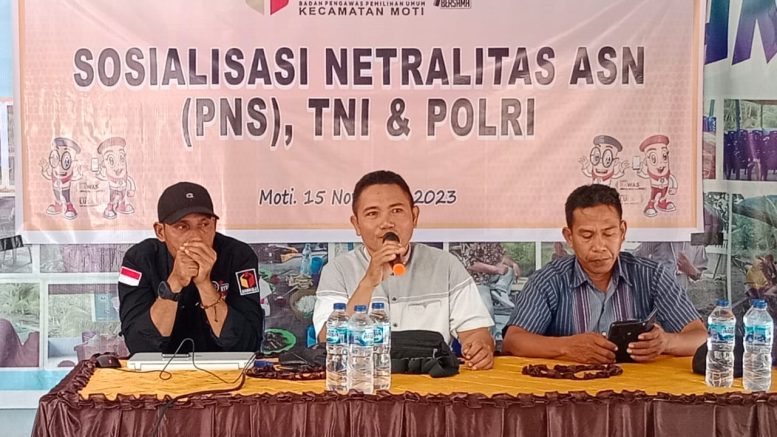 TERNATE – Panitia Pengawas Pemilihan Umum (Panwaslu) Kecamatan Moti menyelenggarakan sosialisasi mengenai netralitas Aparatur Sipil Negara (ASN), Tentara Nasional Indonesia (TNI), dan Kepolisian Republik Indonesia (Polri) dalam Pemilihan Umum 2024. Acara ini dilaksanakan pada Rabu (15/11/2023).