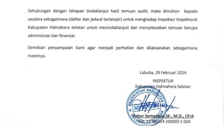 Surat tersebut menindaklanjuti hasil temuan, baik berupa Administrasi maupun Finansial agar diselesaikan. Tercatat, sebanyak 178 Desa, dengan jumlah Kades dan mantan Kades sebanyak 208 orang tersebar di 29 Kecamatan, minus Kecamatan Obi Timur yang Desanya tidak dipanggil menghadap.