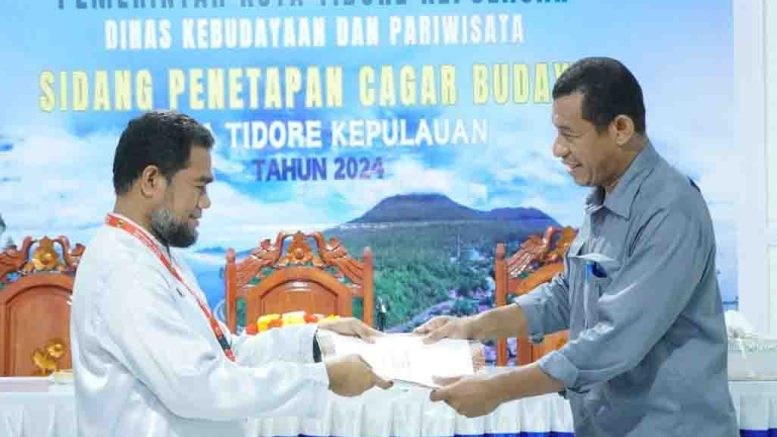 TIDORE – Asisten Sekda Bidang Pemerintahan dan Kesra Dr. Sofyan Saraha menghadiri sekaligus menerima dokumen hasil rekomendasi Tim Ahli Cagar Budaya (TACB) tentang penetapan cagar budaya Kota Tidore Kepulauan Tahun 2024 yang diserahkan oleh Ketua Tim Ahli Cagar Budaya Kota Tidore Kepulauan Hakim di Ruang Rapat Penginapan Bogenfil Kota Tidore, Kamis (7/3/2024).