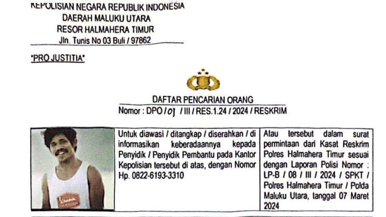 Penetapan DPO tersebut tercantum dalam surat permintaan dari Kasat Reskrim Polres Halmahera Timur sesuai dengan Laporan Polisi Nomor: LP-B/08/III/2024/SPKT/ Polres Halmahera Timur/Polda Maluku Utara, tanggal 07 Maret 2024.