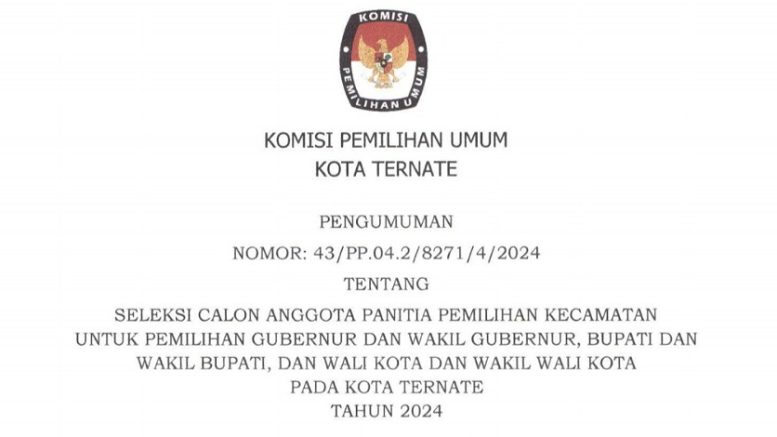 SELEKSI CALON ANGGOTA PANITIA PEMILIHAN KECAMATAN UNTUK PEMILIHAN GUBERNUR DAN WAKIL GUBERNUR, BUPATI DAN WAKIL BUPATI, DAN WALI KOTA DAN WAKIL WALI KOTA PADA KOTA TERNATE TAHUN 2024