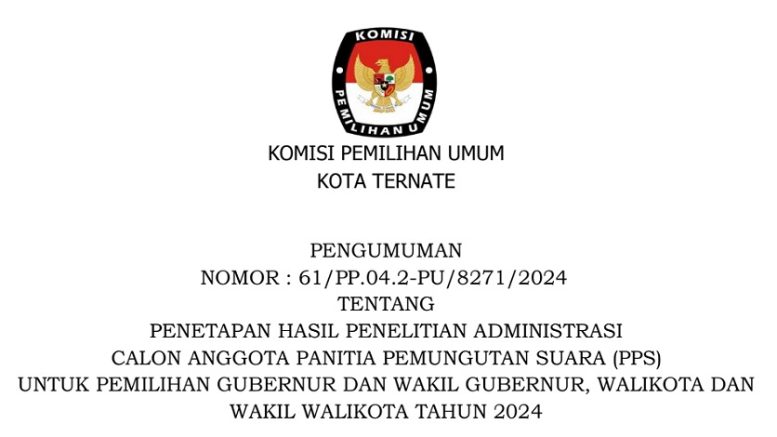 Berdasarkan Berita Acara Rapat Pleno KPU Kota Ternate Nomor 95/PP.04.2-BA/8271/2024 Tanggal 12 Mei 2024 tentang Rapat Pleno Penetapan Hasil Penelitian Administrasi Calon Anggota Panitia Pemungutan Suara (PPS) untuk Pemilihan Gubernur Dan Wakil Gubernur, Walikota Dan Wakil Walikota Tahun 2024, disampaikan hal-hal sebagaiberikut: