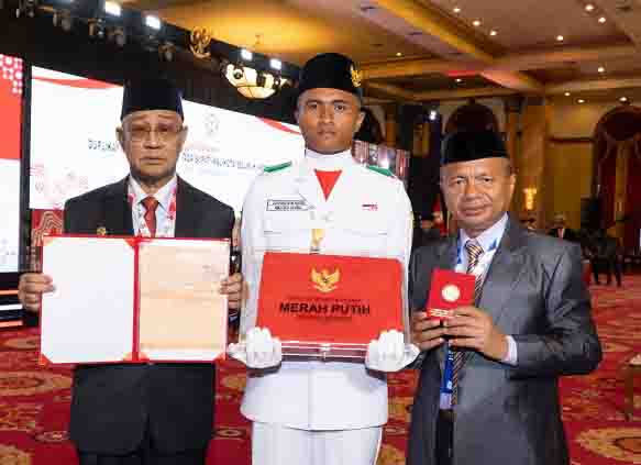 TIDORE – Wali Kota Tidore Kepulauan, Capt H. Ali Ibrahim didampingi Kepala Badan Kesbangpol Kota Tidore Drs. Muslihin, menerima duplikat Bendera Pusaka dari Kepala Badan Pembinaan Ideologi Pancasila (BPIP) Prof. Yudian Wahyudi dalam acara Penyerahan Duplikat Bendera Pusaka Merah Putih oleh BPIP kepada Bupati dan Wali Kota Seluruh Indonesia, yang berlangsung di Balai Samudra, Jakarta.