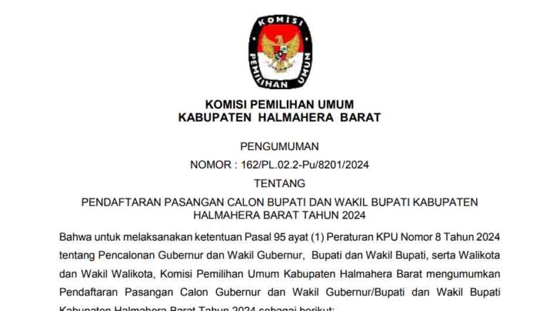 Bahwa untuk melaksanakan ketentuan Pasal 95 ayat (1) Peraturan KPU Nomor 8 Tahun 2024 tentang Pencalonan Gubernur dan Wakil Gubernur, Bupati dan Wakil Bupati, serta Walikota dan Wakil Walikota, Komisi Pemilihan Umum Kabupaten Halmahera Barat mengumumkan Pendaftaran Pasangan Calon Bupati dan Wakil Bupati Kabupaten Halmahera Barat Tahun 2024 sebagai berikut, klik dibawah ini :