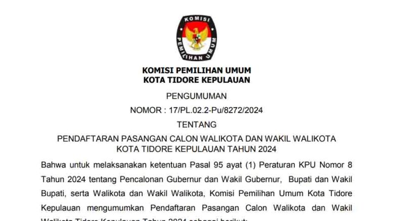 Bahwa untuk melaksanakan ketentuan Pasal 95 ayat (1) Peraturan KPU Nomor 8 Tahun 2024 tentang Pencalonan Gubernur dan Wakil Gubernur, Bupati dan Wakil Bupati, serta Walikota dan Wakil Walikota, Komisi Pemilihan Umum Kota Tidore Kepulauan mengumumkan Pendaftaran Pasangan Calon Walikota dan Wakil Walikota Kota Tidore Kepulauan Tahun 2024 sebagai berikut, klik dibawah ini: