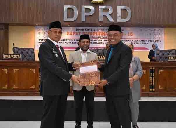 TIDORE – Lima fraksi Dewan Perwakilan Rakyat Daerah (DPRD) Kota Tidore Kepulauan diantaranya Fraksi PDI-Perjuangan, Fraksi Nasdem, Fraksi Partai Kebangkitan Bangsa, Fraksi Demokrat Sejahtera, dan Fraksi Partai Amanat Nasional (PAN), menerima dan menyetujui Rancangan Peraturan Daerah (Ranperda) tentang Rancangan Pembangunan Jangka Panjang Daerah (RPJPD) Kota Tidore Kepulauan Tahun 2025-2045.