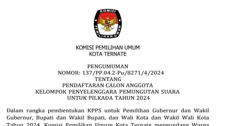 Dalam rangka pembentukan KPPS untuk Pemilihan Gubernur dan Wakil Gubernur, Bupati dan Wakil Bupati, dan Wali Kota dan Wakil Wali Kota Tahun 2024, Komisi Pemilihan Umum Kota Ternate mengundang Warga Negara Indonesia yang memenuhi persyaratan untuk mendaftarkan diri menjadi anggota KPPS untuk Pemilihan Gubernur dan Wakil Gubernur, Bupati dan Wakil Bupati, dan Wali Kota dan Wakil Wali Kota Tahun 2024, Komisi Pemilihan Umum Kabupaten/Kota dengan ketentuan sebagai berikut: