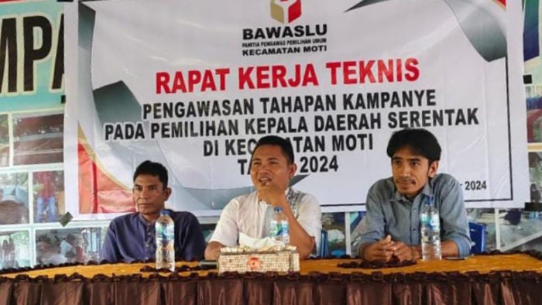 TERNATEPanitia Pengawas Pemilihan Kecamatan (Panwascam) Moti menggelar rapat kerja teknis pengawasan tahapan kampanye pada pemilihan kepala daerah serentak di Kecamatan Moti bagi anggota Pengawas Kelurahan/Desa (PKD) pada Pemilihan serentak 2024.