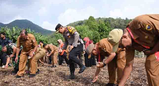 TIDORE – Dukung percepatan swasembada pangan nasional, program prioritas Asta Cita Presiden RI Prabowo Subianto, Pemerintah Kota Tidore Kepulauan berkolaborasi dengan Polresta Tidore dan Kodim 1505/Tidore gelar penanaman bibit jagung di lahan yang telah disiapkan seluas ±30.000 meter persegi, berlokasi di Lingkungan Supera, Kelurahan Doyado, Kecamatan Tidore Timur, Senin (4/11/2024).
