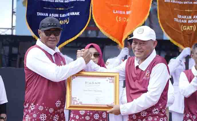 Piagam penghargaan yang diserahkan oleh Wakil Gubernur Maluku Utara, disaksikan langsung oleh Deputi Bidang Keluarga Sejahtera dan Pemberdayaan Keluarga Kemendukbangga/BKKBN Nopian Andusti dan sejumlah Kepala Daerah Kabupaten/Kota se Provinsi Maluku Utara yang hadir.