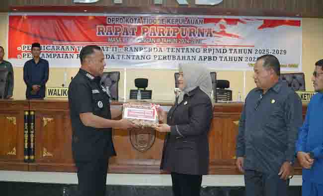 TIDORE – Wali Kota Tidore Kepulauan Muhammad Sinen, menyampaikan Rancangan Peraturan Daerah (Ranperda) tentang Perubahan Anggaran Pendapatan Daerah (APBD) Tahun 2025 beserta Nota Keuangan, di DPRD Kota Tidore Kepulauan. Rabu, (20/8/25)