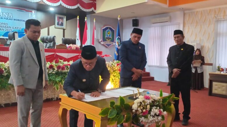 MOROTAI – DPRD Pulau Morotai resmi serahkan rekomendasi LKPJ Bupati 2025 dengan beberapa catatan kritis dari enam fraksi, dalam rapat paripurna, Kamis (23/4/2026).